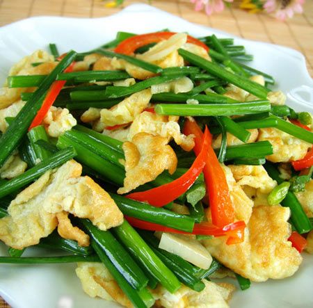 以韭菜为主料做成韭菜炒鸡蛋、韭菜炒肉等,或以韭菜为主料包饺子、包子等。家常菜也可韭菜炒鸡蛋:新鲜韭菜100克,洗净切碎,鸡蛋3只(去壳),同切碎之韭菜捣匀,用素油、食盐同炒至熟佐食。功能:温中养血、温肾暖腰膝。